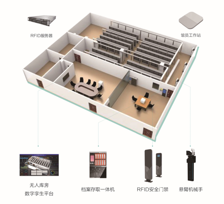 智能無人檔案庫房利用工業級的自動控制技術、RFID自動識別技術與后臺數據庫管理系統相結合,通過深度融合RFID、高精度定位、視覺識別、自動控制等技術于一體的機械手實現檔案全自動上架、下架、精確盤點操作,結合環境監控、視頻監控、三維展示等實現對庫房檔案的無人化、自動化、智能化、可視化管理和全過程跟蹤。